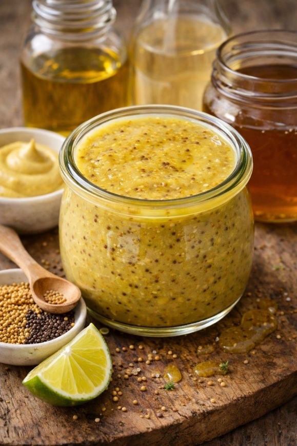 Meng de mosterd met de honing en het appelazijn tot een glad geheel.
