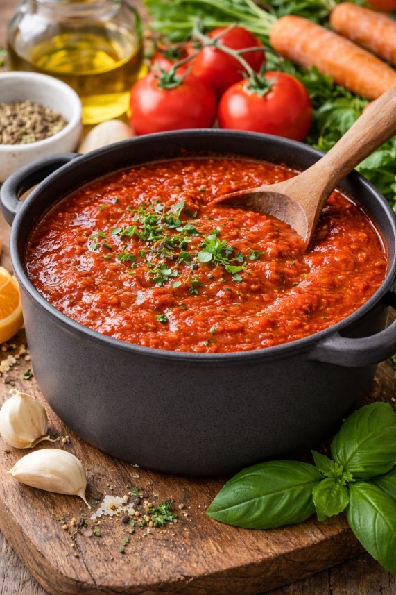 Breng op smaak met oregano en basilicum en laat langzaam indikken voor een volle, pure smaak.